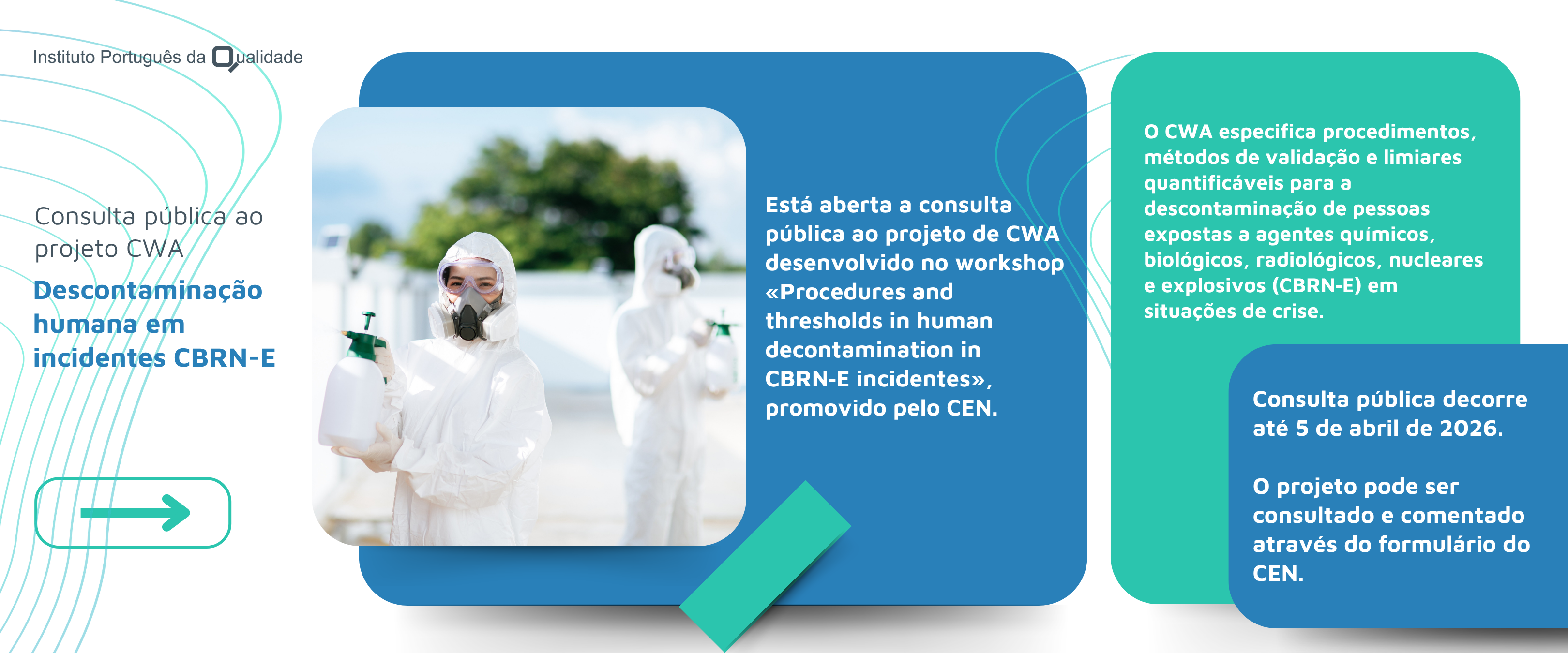 Encontra‑se aberta a consulta pública ao projeto de CEN Workshop Agreement (CWA) desenvolvido no âmbito do workshop “Procedures and thresholds in human decontamination in CBRN‑E incidents”, promovido pelo Comité Europeu de Normalização (CEN).